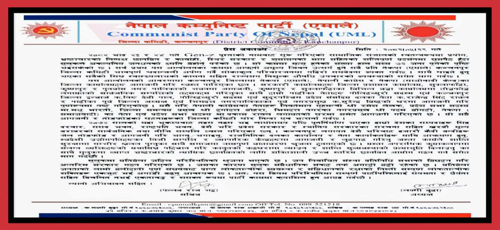 यहीँ भाद्र २३ र २४ गते GenZ काे शान्तिपूर्ण प्रदर्शनका क्रममा घुसपैठ भई देशमा ठूलो जनधनको क्षति भएको नेकपा(एमाले) कञ्चनपुरकाे ठहर छ।
